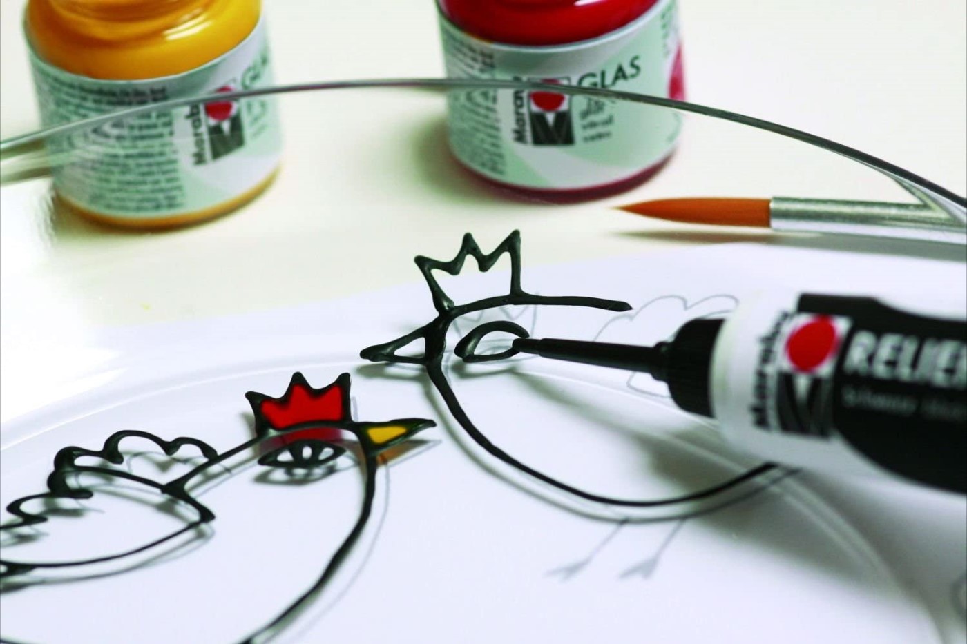 Disegna un disegno a matita su carta. Posiziona lo schizzo sotto il vetro che dipingerai e fissalo con del nastro adesivo. Pulisci la superficie del vetro con un detergente. Successivamente, applica il contorno alla superficie. Le linee di contorno devono essere chiuse per evitare perdite di vernice. Lascia asciugare il disegno per 30 minuti. Quindi, utilizzando un pennello, riempire con cura ogni parte del motivo con le vernici per vetrate Marabu Glas. La vernice si asciuga in 30 minuti, si consiglia di lavare in lavastoviglie dopo 3 giorni ad una temperatura di 50°C.