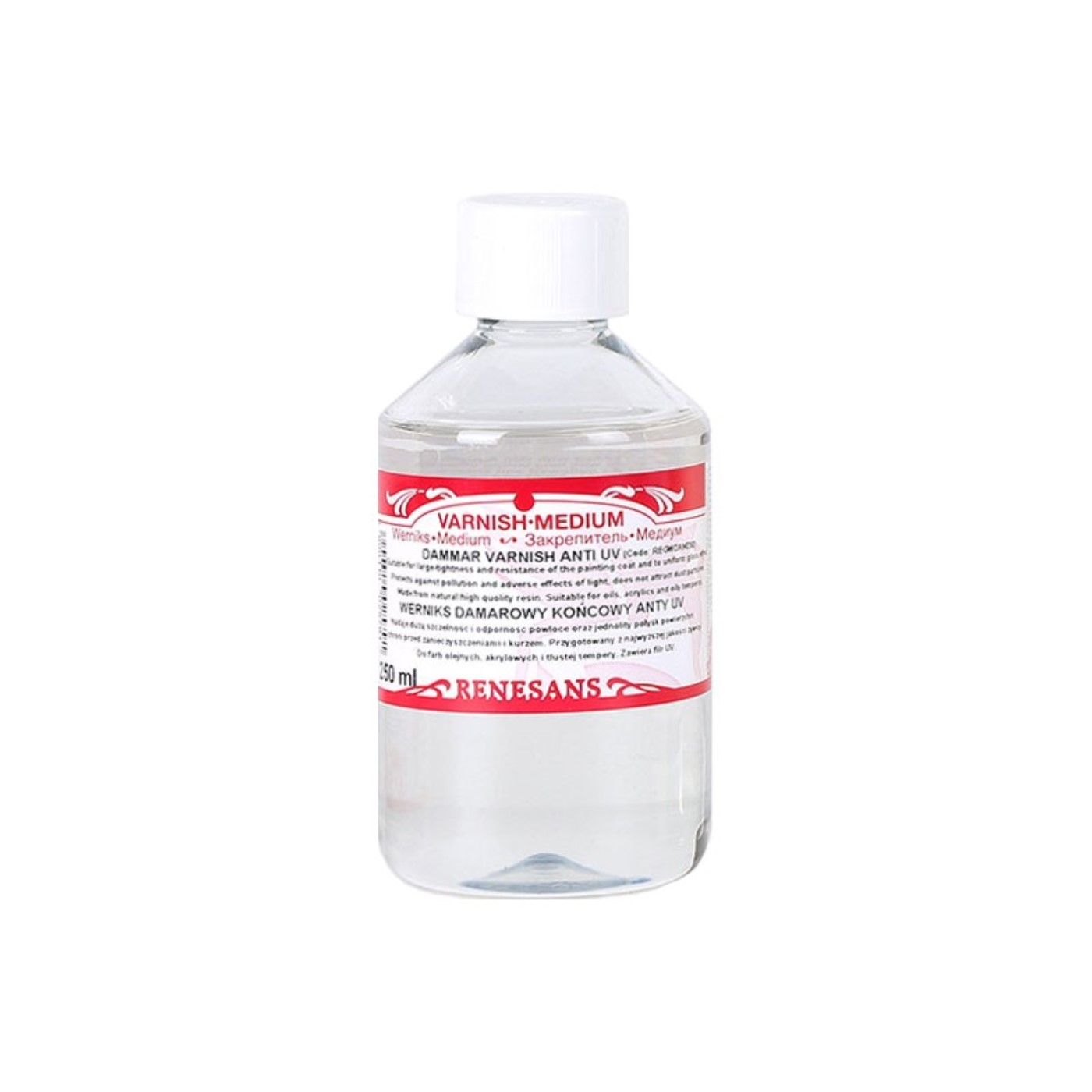 Vernice damascata a brillantezza finale Renesans, con protezioe UV – protegge e dona all’opera una finitura lucida. Rende la superficie dell’immagine più uniforme, i colori appaiono più saturi e profondi. Vernice reversibile con leggera tendenza all’ingiallimento nel tempo. Si applica su una pittura completamente essiccata, dove poi crea una superficie impermeabile, grazie alla quale riequilibra la pittura e la protegge dall’inquinamento e dall’influenza della luce. Realizzato sulla base di resina damar di alta qualità. È destinato principalmente ai colori ad olio, ma può essere utilizzato anche per l’acrilico. Il prodotto è disponibile anche in 100 ml, 250 ml e 500 ml.